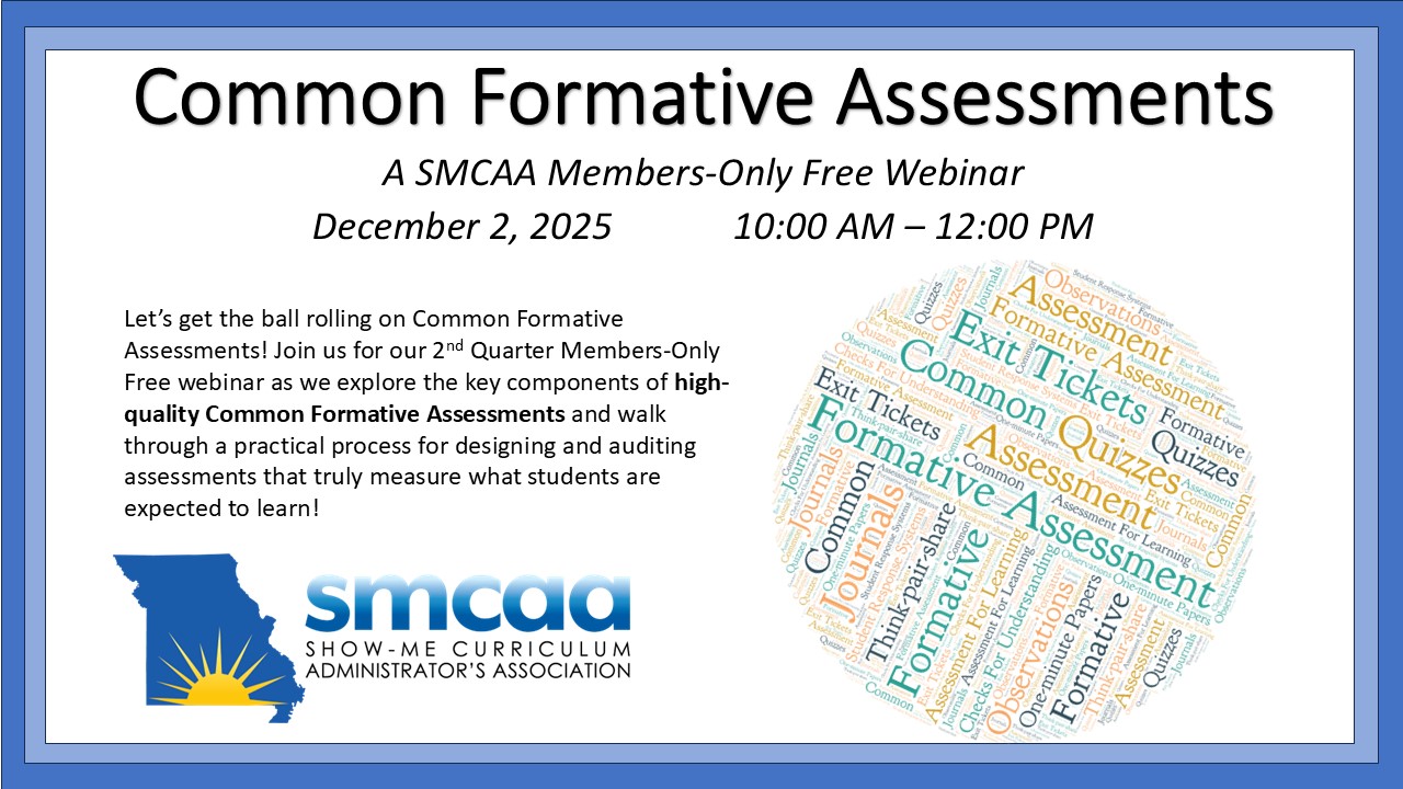 October 16th @ 9:30 a.m. -11:00 a.m. – DESE Assessment Initiative: A Q&A Session with Shaun Bates – DESE is currently amid planning and executing different initiatives in the area of assessment and accountability. Two of the major themes the questions are centered around include the Grade-Level Equivalence (Section 160.518.8, RSMo) which came about after this past year’s legislative session, and the Missouri Assessment Program Success Ready Student Assessments (SRSA).